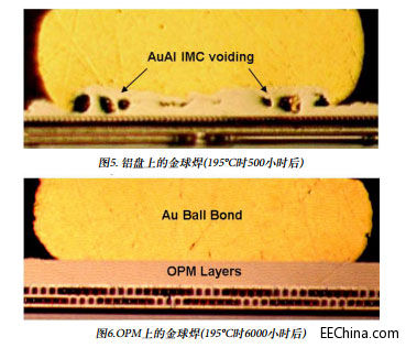 尽管可靠封装有许多考虑因素,高温环境下其中一个主要故障点是线焊。这种故障在行业中常见的塑料封装中尤其成问题,其中金色焊线和铝焊盘是标准配置。高温会加速金/铝金属间化合物的生长。这些金属间化合物与焊接故障相关联,如脆性焊线和空洞,可能时刻都会发生,如图5所示。为了避免这些故障,ADI使用焊盘金属化(OPM)工艺形成金焊盘表面,以便连接焊线。此单金属系统不会形成金属间化合物,在我们的认证测试中已经证明是可靠的,在195°C条件下预备超过6000小时,如图6所示。尽管ADI在195°C展现出可靠的焊接性能,但是受限于模塑化合物的玻璃化转变温度,塑料封装的额定工作温度最高仅到175°C。