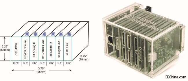 这款可放在掌中的微型PLC集成了必要的32位微控制器和以太网连接,处理和连接总共25路I/O通道。具体包括: