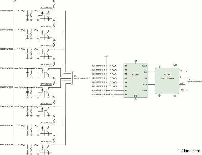 实现微型尺寸的方法之一是使用集成模拟器件,而不是大量甚至数百个分立元件。电路板尺寸减小、功耗降低、可靠性提高。图3所示为八通道串行器(MAX31911)和四通道数据隔离器(MAX14932),代替了传统设计(左图)中的数十个分立式光耦和数以百计的电阻及电容。这款紧凑的微型PLC方案的I/O通道容量与普通PLC相同。