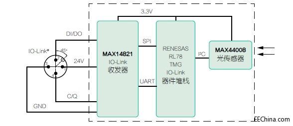 IO-Link协议全球范围内工业设备标准化,实现相互之间的互操作性。该标准既可直接应用于PLC,也可集成至所有标准现场总线。这种灵活性使其很快成为智能器件通信的事实标准,例如Maxim的Santa Cruz光传感器MAXREFDES23# (图4)。