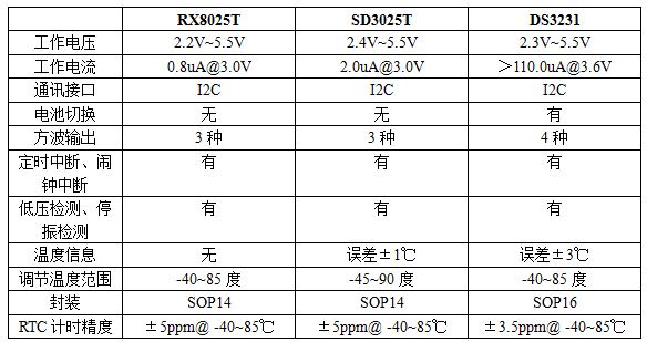 现在市面上常用的带温度补偿RTC芯片有EPSON公司的RX8025T芯片,Maxim公司的DS3231芯片和SDIC公司的SD3025T芯片等。下表对比3种芯片的主要差异: