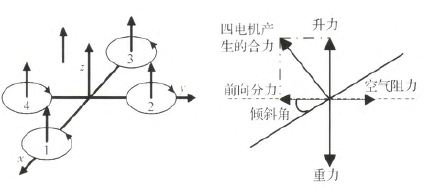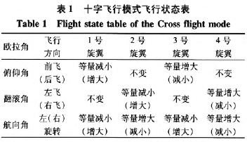 以十字飞行模式为例,l号旋翼为头,1、3号旋翼逆时针旋转,2、4号旋翼顺时针旋转,如图1所示。