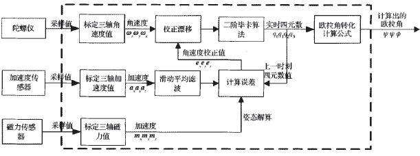 由于传感器存在器件误差,因此在使用前需要标定。陀螺仪在静止时,角速度为0;但实际情况由于器件误差并不为0,因此可在静止时采样500次数据,再求平均,得出偏移量,标定陀螺仪数据;加速度传感器可依据在静止时,三轴重力加速度平方和的开方为重力加速度的标定方程,利用最小二乘法求出标定偏移值和误差值进行标定。而磁力传感器校正,可将器件静置于桌面旋转一周找出最小值和最大值,通过电子罗盘校正计算公式计算出标定偏移值和误差值。