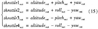 式(15)中throttlelOut到throttle4Out为油门1到油门4输出值,依据公式(13)输出的AngelOut分为三轴角度:pitchOut为仰俯角输出值,rollOut为横滚角输出值,yawOut为航向角输出值。
