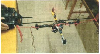 本次测试姿态解算更新周期T ≈ 4 mS,PID控制更新周期T ≈ 10 ms,期望值为水平0度。将四轴飞行器控制仰俯角的一对电机固定住,另一对边能自由旋转,即能改变横滚角度,如图6所示。将横滚角倾斜到 - 70°,遥控器油门迅速推到1400,平衡后如图6所示。