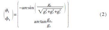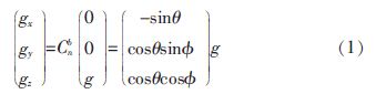 沿平衡车3 个机体轴即直立时正前、正右、正上方向定义为x、y、z 三轴参考坐标系。所受的3 轴重力加速度分量定义为gx、gy、gz。假设两轮平衡车处于静止或匀速运 行的状态。得到重力加速度与平衡车姿态角度的关系如式1所示: