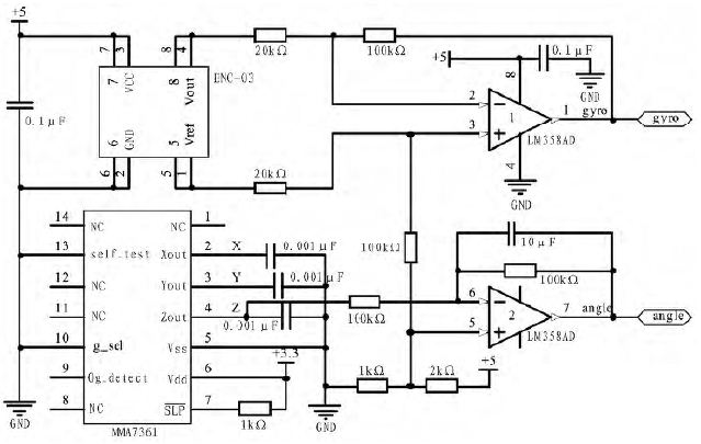 该系统中惯性组合测量电路如图1 所示, 由加速度计MMA7361、陀螺仪ENC-03 及放大电路组成。实现对加速度计和陀螺仪测得信号进行放大。加速度计和陀螺仪信号经放大,分别由angle 引脚和gyro 引脚输出后,信号通过AD 采样转换为数字信号,传递到微控制器中,再利用互补滤波算法,得到姿态角度。