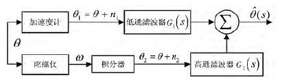 选用的滤波传递函数需满足G1(s)+G2(s)=1,由加速度计得到θ1经低通滤波器和陀螺仪得到θ2经高通滤波器后的数据融合为角度估计值