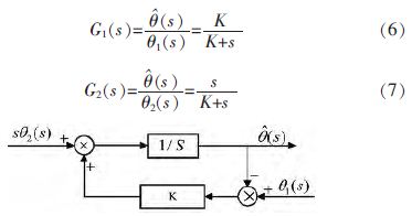 为互补滤波算法后估计的角度值, 加速度计测量中引入的高频噪声n1,陀螺仪测量中引入的低频噪声n2,用低通滤波器G1(s)消除加速度计中的高频噪声n1,用高通滤波器G2(s)消除陀螺仪中的低频噪声n2。两个滤波器的传递函数, 被设计为(6)、(7)所示,图4 结构可化简为图5 结构。