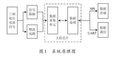 根据三相电信号数据采集系统的应用环境,本文开发的数采系统硬件部分由模拟信号获取、调理单元,数据采集与处理单元和数据存储数据通信四大模块组成。系统的原理如图1所示。