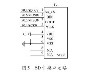 SD卡与微控制器之间的通信有SD和SPI两种接口模式[4],由于LPC2103内部拥有串行外设SPI总线,且使用SPI总线时能够节省主控制器的I/O资源,因此本设计采用SPI接口方式实现SD卡与主控制器的通信,接口电路如图5所示。