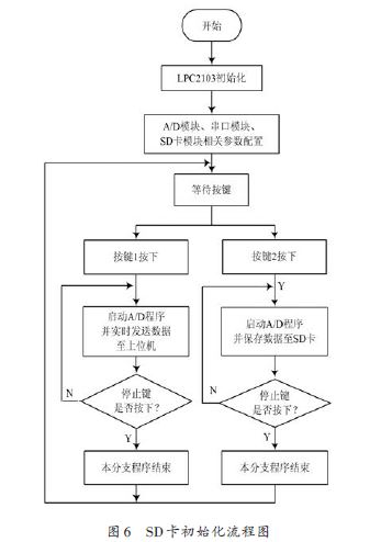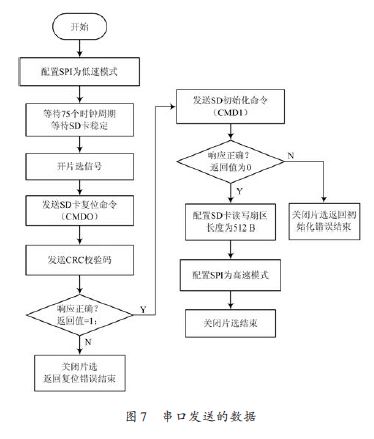 程序的初始化主要包括:GPIO端口、定时器模块、A/D模块、SPI接口单元、UART接口单元、SD卡等6大模块。对SD卡的操作按照其数据手册,通过主控制器发送给SD卡相应的命令来完成。SPI模式下,SD卡的指令由6B组成,主控制器向SD卡发送指令时,高位字节在前,低位字节在后。操作流程如图7所示。