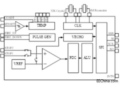 UTA6905是一款超声波流量表和超声波热量表的专用芯片,其内部结构如图3所示,集成了相位差测量单元、温度测量单元、脉冲发生器等设计超声波电子式水表必需功能,芯片采用了先进的时间数字转换技术,对时差的测量分辨率可达32ps,温度测量单元分辨率高达0.002℃;此外芯片还集成了第一波检测、换能器回波振幅检测、换能器断线检测等额外功能,使水表可以完成部分自诊断功能,智能化水平得以提高。