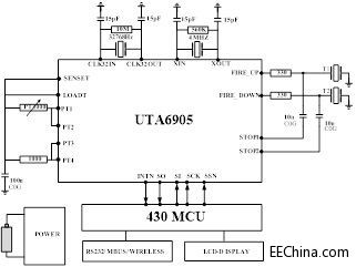 采用UTA6905设计的超声波电子式水表方案框图如图4所示,给出了详细的流量采集相关的外围电路:时钟部分包括一个32768HZ的晶体振荡器和一个4MHz的陶瓷振荡器,相位差测量电路需要一对谐振频率1MHz的超声波换能器和一对由电阻电容构成的信号通路,温度测量电路需要一只PT1000热电阻、一只低温漂(50ppm)的1K欧姆电阻和一只100nF充放电电容,主控芯片选择了一款低功耗的MSP430系列MCU,通过IO口连接UTA6905的SPI引脚和中断引脚;此外还包括电源稳压电路、LCD显示电路,通信方面可支持红外、MBUS等功能,以实现无线抄表或数据的远传。