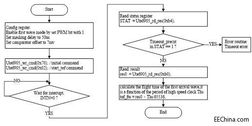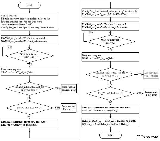 顺流回波与逆流回波在两次方向相反的收发过程中先后出现的,因此无法直接测量两次回波的相位差脉冲,UTA6905利用相差法原理是通过分别测量顺逆流回波相对于同一个参考信号的相位差,间接推算出顺逆流回波的相位差,最后得到的相位差和时间差实际上是一致的,UTA6905与目前主流的时差法芯片另一个重要区别在于它可以在一次顺逆流测量流程中记录多达31个回波的相位差并进行自动积分运算,起到了提高精度的作用,而其他的时差法芯片例如GP22等在一次顺逆游测量中最多记录3个脉冲的传播时间,实际测试也证实了UTA6905测量的精度和稳定性都有明显的提高。