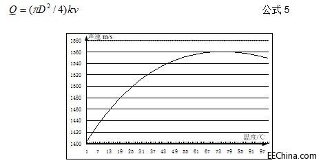 从公式4看,流体流速v是声速c和传播时差△t的函数,因为超声波在水中的传播速度c是一个随温度变化的值,如图2所示。所以在超声波水表中,除了对顺逆流传播时差△t进行测量,还需要对流体温度进行测量,通过查表得到当前温度下的超声波传播速度c。
