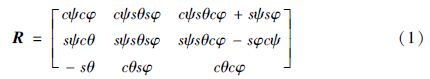 图1 中涉及到惯性坐标系- E 系和载体坐标系- B 系,φ,θ,ψ 分别表示惯性坐标系下载体的欧拉角,定义Θ =[φ θ ψ]T 。则根据坐标系变换原则,载体系到惯性系的变换矩阵R 如式1 所示,其中c 表示余弦函数, s 表示正弦函数。