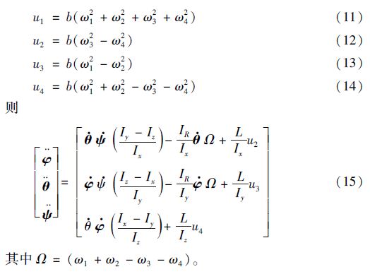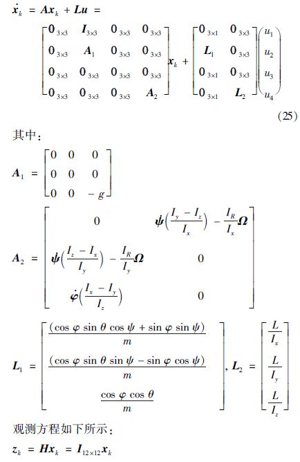 , 四轴飞行器的速度和欧拉角由惯性导航单元(InertialMeasurement Unit, IMU)测量及解算。根据四轴飞行器的运动学方程,建立如式(25)所示的状态方程: