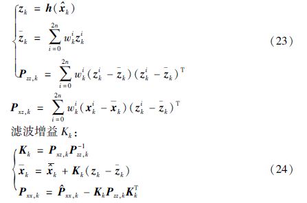测量更新:计算k 时刻测量量zk 及其均值zk 、方差矩阵Pzz,k 及协方差矩阵Pxz,k 。