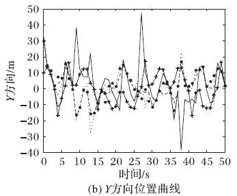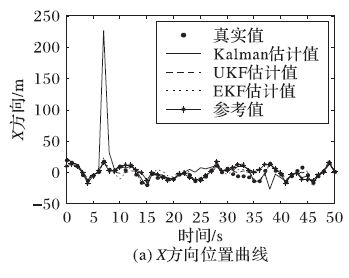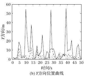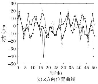 根据四轴飞行器的数学模型及各滤波算法的递推公式,使用Matlab 对系统进行动态仿真。四轴飞行器的空间状态初始值设为:三个方向的位置初值x(0) = 20 m, y(0) =30 m, z(0) =2 m, 三个方向线速度、角速度和角加速初值为零。图2(a) ~ (c)分别为X,Y,Z 三个方向的载体位置曲线。图中的真实值为视觉导航系统给出的位置估计。