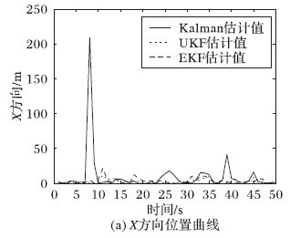 Kalman 滤波在对非线性特征的四轴飞行器的位置滤波上存在明显的滤波偏差,相比之下,EKF 和UKF 有较好的滤波效果,三个方向的估计值误差曲线如图5、图6、图7 所示。从X,Y,Z 三个方向的估计误差曲线图上,更能直观地看出三种滤波算法的滤波结果,滤波估计误差的均方差如表1 所示。