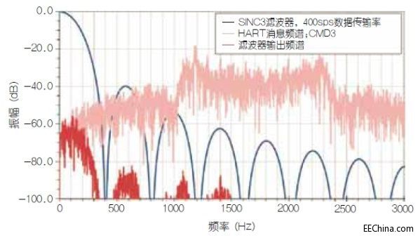 不幸的是,真实情况远没有那么简单。当一条完整的消息经过HART发送后,HART FSK调制信号频谱不仅在基频调制频率处包含电能,且在1.2kHz与2.2kHz载波之间、下方和上方包含频率分量。图4显示了HART FSK消息在ADC输入端的典型频谱,以及通过SINC3滤波器以400Hz陷波衰减时的频谱。本例中,主机发送HART命令3,从机响应该命令。