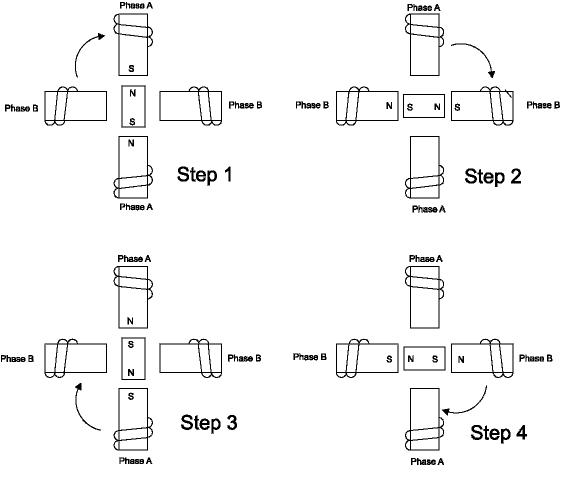 为线圈绕组施加电压会产生电磁场,出现南北极。定子承载着磁场。通过顺序通电或“步进”定子线圈,能改变磁场,进而生成旋转运动。图2描述了双相电机的工作情况。在第一步中,为双相定子的A相施加电压,就会将转子磁锁在如图所示的位置,这是因为异性相吸;在第二步中,关闭A相打开B相,让转子顺时针旋转90度;在第三步中,B相打开,极性与第一步相反,又产生90度旋转;在第四步中,A相关闭,B相打开,极性与第二步相反。重复上述序列会让转子每次以90度步进顺时针旋转。