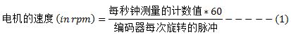 在与电机相关的应用中,“测速”是常见的要求之一。如前所述,可在解码器模块中存储电流计数值。由于电机的速度通常是根据每分钟的旋转次数来测量的,因而我们可通过每分钟对计数值进行测量来测得电机速度。例如,在每一分钟后,我们都能重设计数值,也能使用计数值差额进行计算。事实上,不用等待每分钟都做计算,我们可测量每秒钟的计数值并乘以60,但这种方法的准确度会低于每分钟测量到的情况。那么,电机的速度计算如下:
