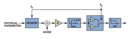传感器输出端的噪声可能受内部源或外部耦合的影响。低频(1/f)噪声经常会限制传感器或测量电子设备的性能。很多传感器还容易受到低频环境噪声的干扰。光学测量容易受到背景光照的影响;电磁传感器容易受到电源辐射的影响。自由选择激励频率以避开噪声源是同步解调的重要优势。