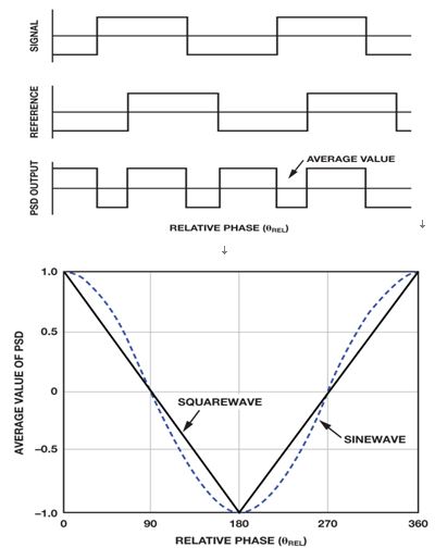 当输入和基准电压完全无相移时,相对相位为0°,开关输出为直流,且PSD输出电压为+1。随着相对相位增加,开关输出成为基准频率两倍的方波,且占空比和均值线性下降。相对相位为90°时,占空比为50%,平均值为0。在180°相对相位处,PSD输出电压为–1。图2b显示了相对相位在0°至360°范围内扫描时的PSD平均输出值,输入信号为方波和正弦波。