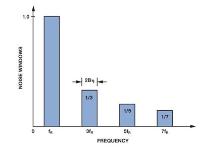 乍看之下,谐波的无限求和混叠进入输出滤波器通带,似乎使这种方法失效。然而,由于每一个谐波项都成倍缩小,并且各谐波噪声以平方和的平方根方式相加,噪声混叠的影响得以减轻。假设输入信号的噪声频谱密度不变,那么就可以计算谐波混叠的噪声影响。