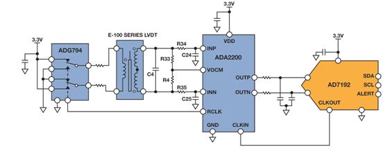 24位Σ-Δ型ADC AD7192生成的4.92 MHz时钟用作主机时钟。ADA2200生成滤波器和PSD时钟所需的一切内部信号,此外还在RCLK引脚上生成激励信号。该器件将主机时钟进行1024分频,以便生成4.8 kHz信号,控制CMOS开关。CMOS开关将低噪声3.3 V源转换为LVDT的方波激励信号。用于激励源的3.3 V电源还用作ADC基准电压源,因此电压源中的一切漂移都不会降低测量精度。在满量程位移处,LVDT输出1.6 V峰峰值输出电压。