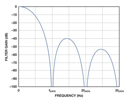 图6显示了归一化为ADC输出数据速率的sinc3传输函数。