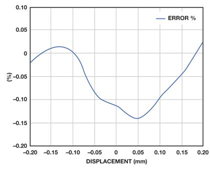 用于电路评估的E系列LVDT线性度额定值为±0.5%(±2.5 mm位移范围)电路性能超过了LVDT的规格。