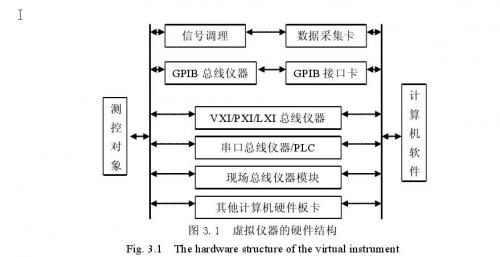 硬件是虚拟仪器工作的基础,主要完成被测信号的采集、传输、存储处理和输入/输出设备等工作,由计算机和I/O接口设备组成。计算机一般为一台PC机或工作站,是硬件平台的核心,它包括微处理器、存储器和输入/输出设备等,用来提供实时高效的数据处理。I/O接口设备即采集调理部件,包括PC总线的数据采集(Data Acquisition,DAQ)卡、GPIB总线仪器、VXI总线仪器模块、PXI总线仪器模块、LXI总线仪器模块、串口总线仪器和现场总线仪器模块等标准总线仪器,主要完成被测信号的采集、放大和模数转换。现场智能单元就是由工业测控机及信号调理转换模块等所组成。