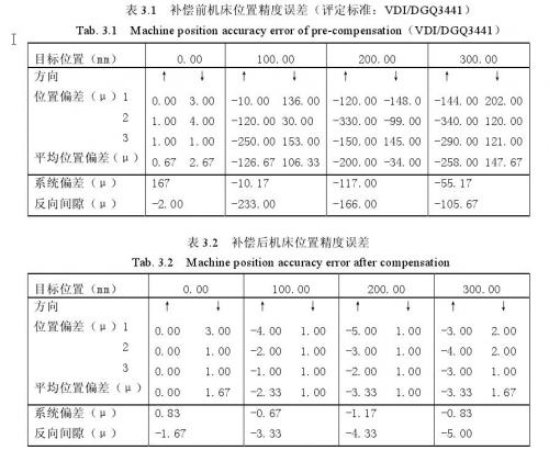 测得的补偿前后机床的三次运动的正向和负向位置精度误差如表3.1和表3.2所示。