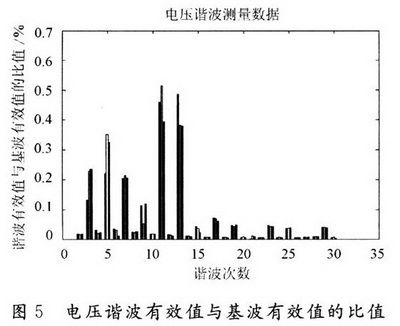 电能质量检测结果主要包括电流、电压的谐波分析数据、电功率测量值数据、供电电压的测量数据、频率的测量数据、三相不平衡度的测量数据、闪变的测量数据以及误差分析等。从实测数据中可以看出,由于各种非线性电力电子装置的广泛使用,增加了高次谐波的含有量,现以三相电压的谐波分析数据为例,得到第2~30次谐波的谐波含有率,即第n次谐波有效值与基波有效值的比值,如柱状图5所示。