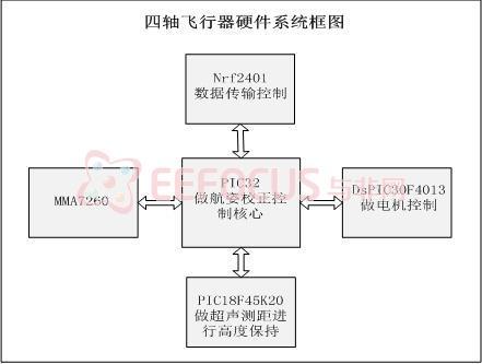 考虑到现实实验室的条件,实用采用以下的硬件方面采用PIC32做航姿校正控制核心,DsPIC30F4013做电机控制,PIC18F45K20做超声测距进行高度保持,nRF2401做数据传输,加速度传感器MMA7260。图1就是该系统框图。