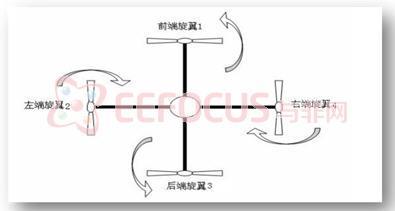 首先,为了克服飞行器自旋,必须相邻的任意两电机转向相反;而位置相对的一对电动机转向一致(如上图所示),通过精确调整这两对电机的转速,使其反扭矩相互抵消,在此调整过程中为避免造成飞行器侧倾或俯仰角度发生变化,需同步改变位置相对的一对电动机的转速。