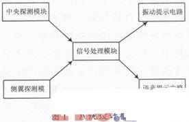 如图1所示本设计由探测,处理,提示3大部分组成。其中探测模块由中央探测和侧翼探测2个部分组成,探测模块所输出的信号发送给STC12C5A60S2单片机,通过A/D转换、判别并通过语音芯片和震动器作距离提示。