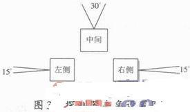 本设计侧翼探测模块使用红外测距传感器探测。该探测器采用三角测量原理(如图2所示),可以测得装置到障碍物的距离(20~150 cm),探测角15°(见图3),距离以模拟量输出,经单片机A/D转换后,根据需要设置多重范围报警。本设计的3个探测器将分别负责3个方向的探测,角度设置如图3所示。