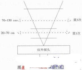 本设计的报警提示将以一定时间间隔以振动频率/语音连续提示。超声波测距器所探测到的距离将以语音的方式提示使用者,形式为X.XX m,精确到百分位。红外探头则将20~150 cm分为两段,即20~70 cm和70~150 cm.第1个区间震动器将在1 s内振3次,第2个区间在1 s内振1次以分清距离,如图8所示。
