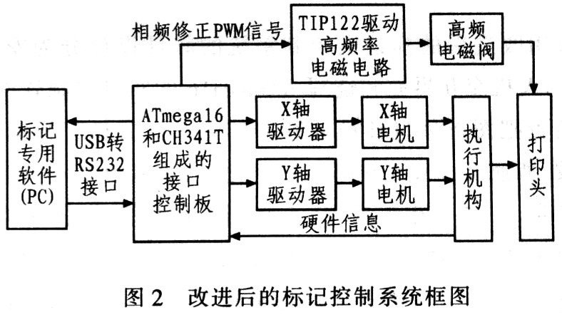 由于普通标记机控制系统的标记专用软件将图形信息转化为脉冲信息后需通过I/O接口(ISA、PC扩展卡或并口)输出至驱动控制板,然后再由驱动电路执行机构工作。但目前大多数个人PC机、笔记本电脑都取消并口、串口配置的扩展I/O卡,而使用IJSB接口。普通标记机的PWM信号采用555振荡器和多个阻容元件构成一个无稳态的占空比和频率均可调的多谐振荡器,当调整PWM信号时,打开控制箱,则通过调节两只可调电阻调整PWM信号的频率和占空比。为了解决上述标记机控制系统存在的缺点,采用单片机ATmegal6和USB转换RS232接口器件CH341T组成通信接口,标记控制系统升级到USB接口:采用ATmegal6的相频修正PWM替换555振荡电路,可直接通过PC软件修正PWM信号的频率和占空比,使得PWM信号调整便捷。