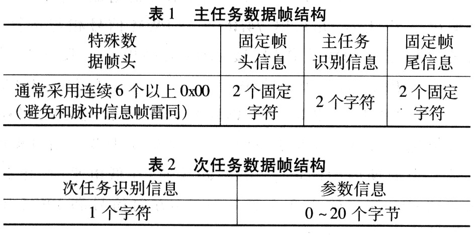 ,则当TOP确定后,调整OCRlx值。即调整占空比来获得所需的PWM波形。采用固定TOP值工作模式时,建议使用ICRl寄存器定义TOP,这样OCRlA就可采用OC1A输出的PWM(共用相同4气动标记机控制系统软件设计采用改进后的标记机控制系统的软件设计分为安装在PC上的人机交互界面和烧写ATmegal6的实时控制软件。其前者负责把图形信息转换成脉冲信息及设置标记机运动相关参数,如速度、PWM频率和占空比等;后者负责接收PC发送的信息,并进行相关处理,再将当前硬件信息返回到PC。传输的信息分为两大类:一类是带固定信息头和固定信息尾的普通数据帧;另一类是无信息头和无信息尾的脉冲数据帧信号。这样可以大大减少在标记过程中的数据发送量,降低ATmegal6在实时标记过程中断脉冲输出任务处理接收串口数据的次数,使得执行机构运动更流畅。有信息头和信息尾的数据帧结构为:表1所示的主任务数据帧结构和表2所示的次任务数据帧结构。表2中的参数信息的字节个数是根据次任务识别信息区分是否带参数或带参数的字符个数。