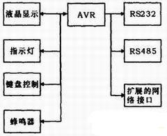 硬件系统主要由CPU(AVR单片机)、人机操作和显示接口(液晶显示、键盘、指示灯和蜂鸣器)、通信接口组成。系统框图如图1所示