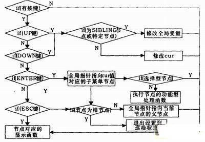 对于用户按键操作切换不同的菜单时,我们只需修改一个指向对应菜单节点的全局菜单节点指针即可。当用户按下“ESC”键时,菜单指针指向当前节点的父节点,按下“Enter”键时,则指针指向对应节点的子节点。