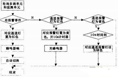 以上菜单项的设计用于系统设置部分,当退出系统设置时,即进入系统循环检测部分。单片机通过RS-485接口检测各个通道是否正常,当正常时则显示为绿灯,出现异常则显示为红灯,黄灯为中间状态。指示灯的流程参见图4.