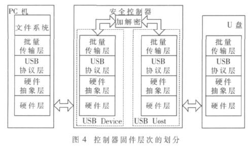 (3)USB Device模块:向PC机报告USB设备的插入;响应PC机发出的标准的USB命令,返回相应的数据,如各种描述符等。此时返回的描述符应为安全控制器的描述符;响应PC机发出的USB MassStorage命令,返回设备的基本信息,此时返回的基本信息应为U盘的信息。
