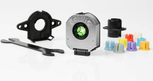 基于电容式技术之编码器具备众多优势,不仅仅提供了改进的性能和可靠性,比如CUI的AMT31器件内置ASIC/微控制器,提供了支持可编程设置和安装特性的智能功能,实现运作智能并且简化存货管理。当这些特性结合基于PC的GUI,能够提供易于使用的复杂功能,极大地简化编码器使用的方方面面,从样品设计、评测和调试,直至安装和配置,以及诊断和存货最小化。所有这些均以针对其它编码器的类似价格,维持与标准输出类型和格式的兼容性,同时实现较低的功耗。AMT31具有易于安装的适配器,用于不同的电机轴尺寸,参见图5,它代表着利用智能接口的合理以提供其它编码器技术所不具备的广泛优势的下一步举措。
