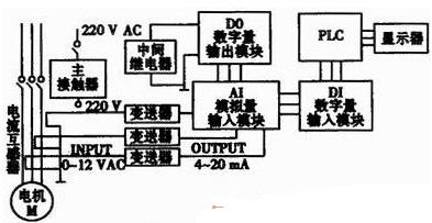 硬件主要包括主控计算机、模数转换模块、控制接触器和模拟信号提取等部分。主控计算机由主控制器PLC(西门子公司的可编程逻辑控制器PLC)、键盘、鼠标、显示器构成,控制接触器由中间继电器和主接触器构成,模拟信号提取由电流互感和变送器构成,模数转换模块由外部扩展数字量输出模块DO、数字量输入模块DI和模拟量输入模块AI等构成。硬件设计框图如图2所示。